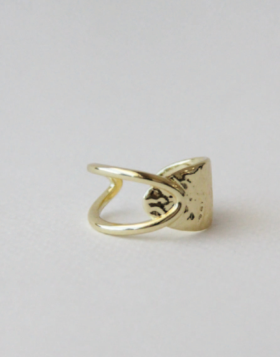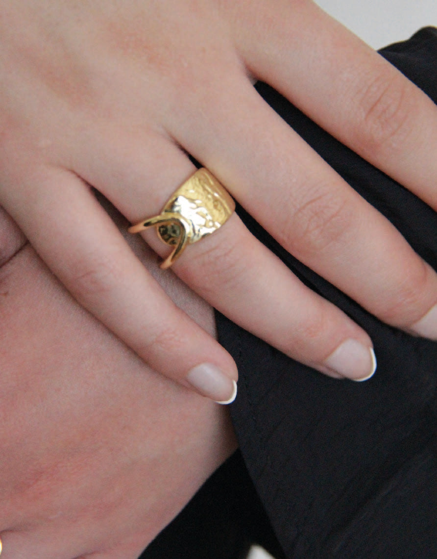 Un diseño que fusiona la modernidad con el arte de la tradición, este es un anillo único con efecto martillado y liso que se entrelazan entre sí que le otorga una textura vibrante y fascinante. El enchape en oro de 18k amplifica su elegancia, brindando un brillo cálido y sofisticado.