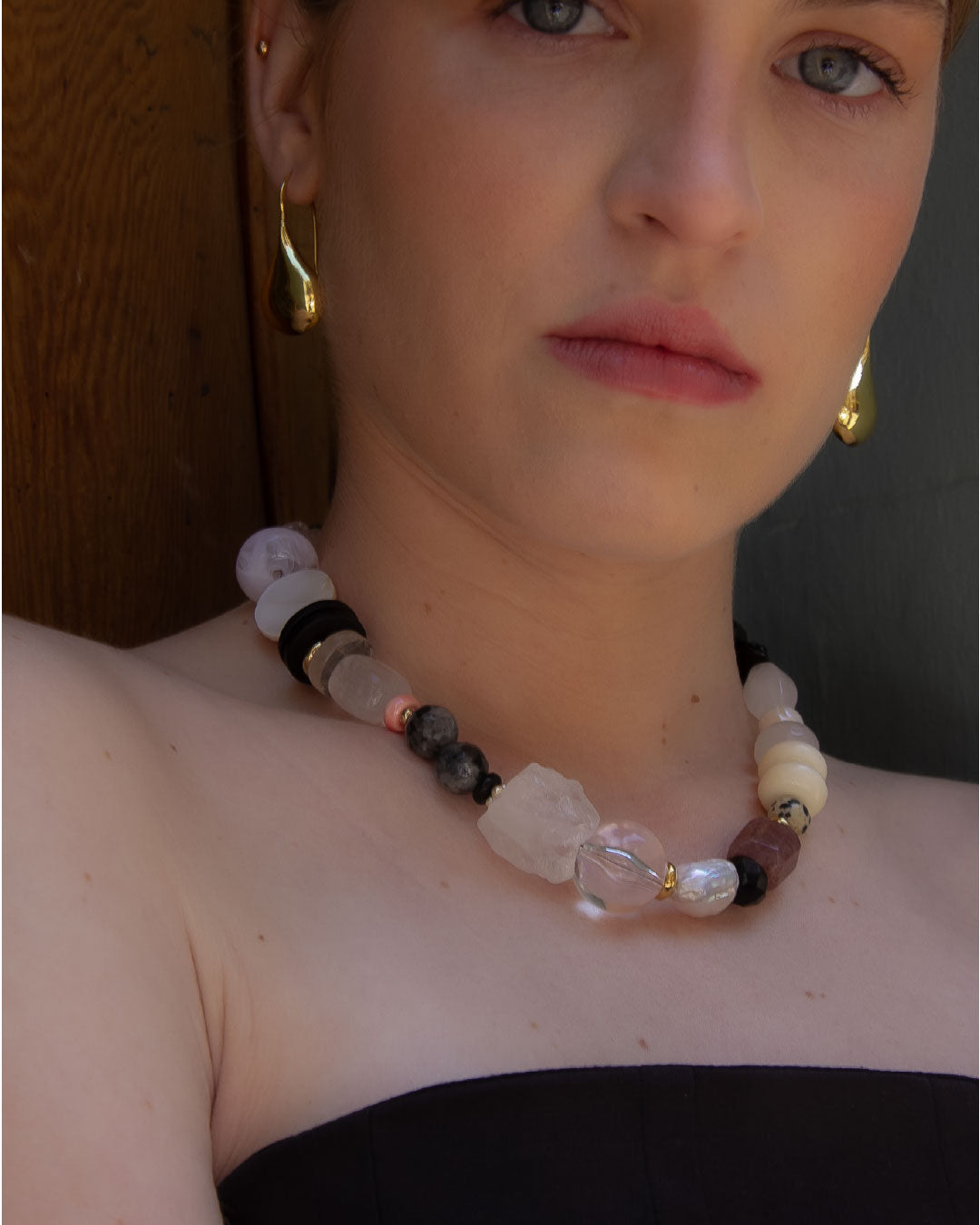 El collar Dalmatien refleja la elegancia del contraste. Inspirado en el patrón icónico del dálmata, combina piedras de cuarzo translúcido, detalles negros y sutiles tonos rosados en cerámica que se entrelazan con la suavidad de las perlas. Su composición es una fusión equilibrada de texturas y brillos: vidrio, resina, cerámica y piedra natural conviven en perfecta armonía.