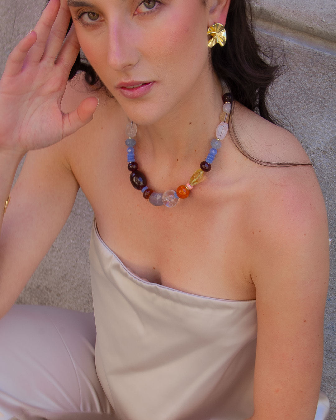 Ónix esmaltado en naranja, piezas amarillas transparentes, piedras y cuentas azul-lila variadas, cuarzo, resina y vidrio, con terminaciones bañadas en oro de 18 quilates con 11 micras de espesor.