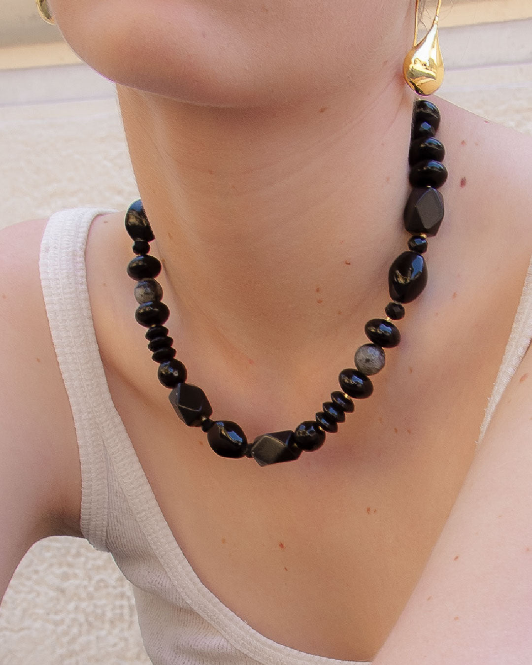 Cada piedra aporta su propio carácter: cristales checos, ónix esmaltado y cuarzo en tonos profundos que se entrelazan para crear un equilibrio perfecto entre brillo y opacidad. El resultado es un collar atemporal, lleno de sofisticación.