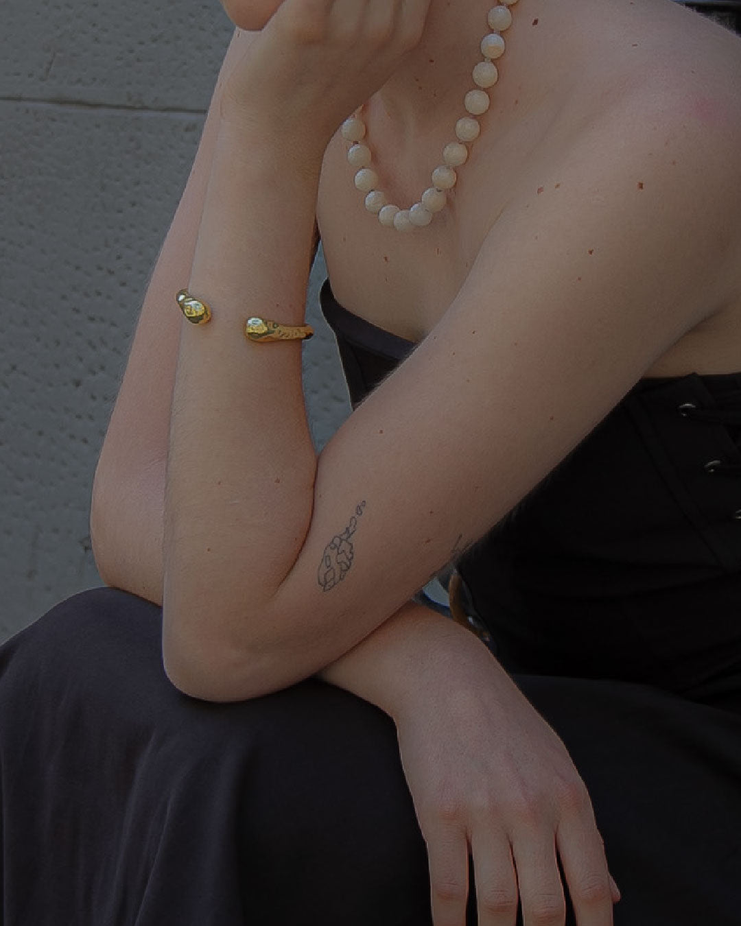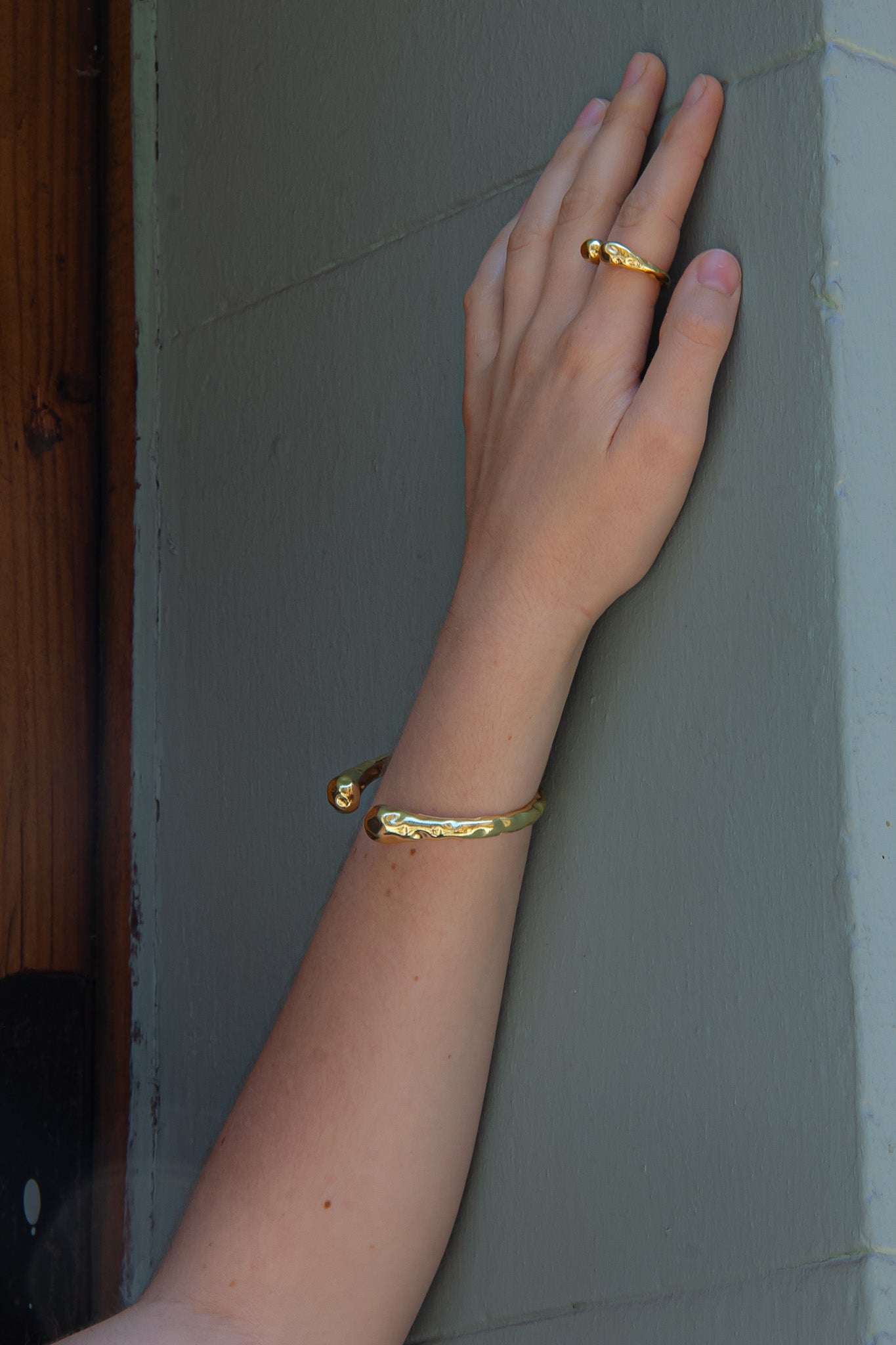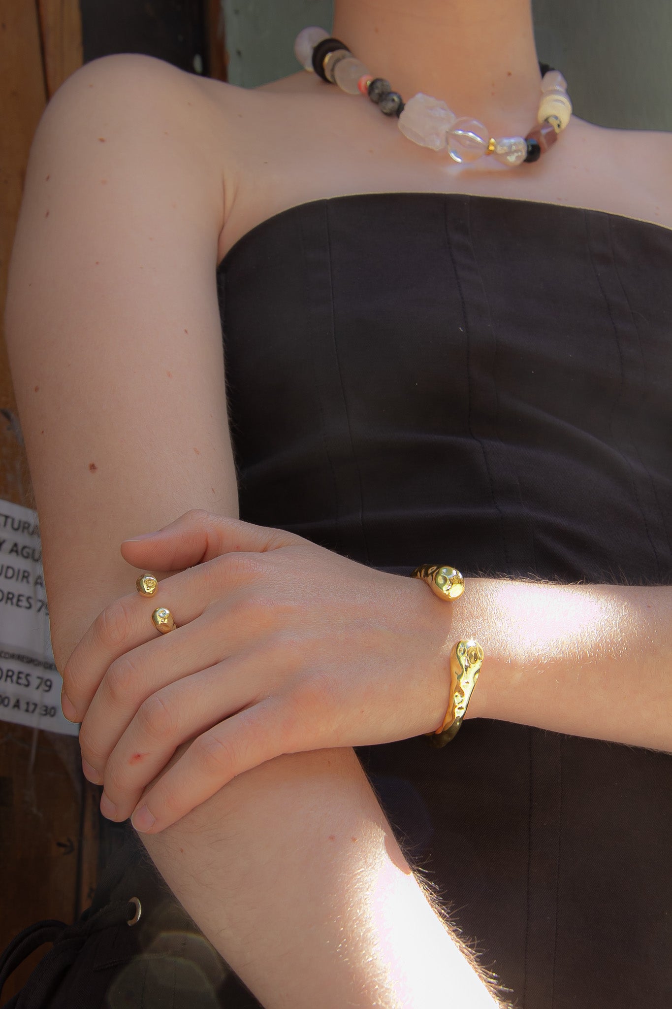 Inspirada en las formas naturales y la imperfección del trabajo manual. Esta esclava chapada en oro 18k de 11 micras presenta un diseño orgánico con superficie martillada que refleja la luz de manera única. Cada relieve aporta textura y carácter, convirtiéndola en una pieza con alma artesanal y un brillo dorado sutilmente irregular, ideal para quienes valoran la belleza en los detalles.