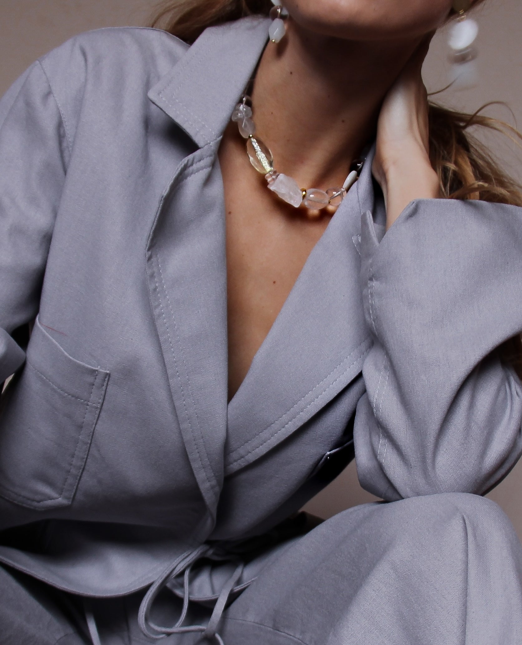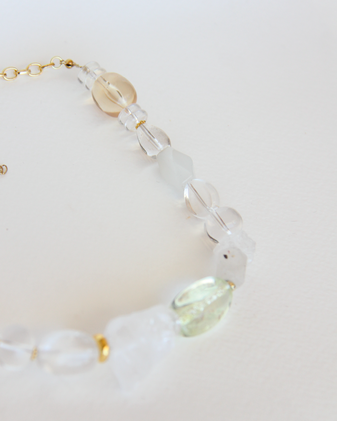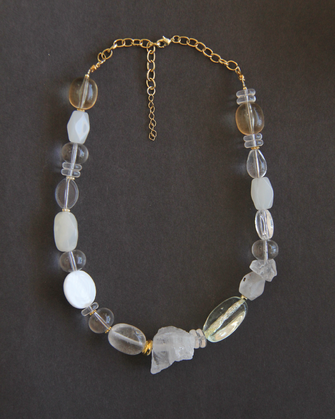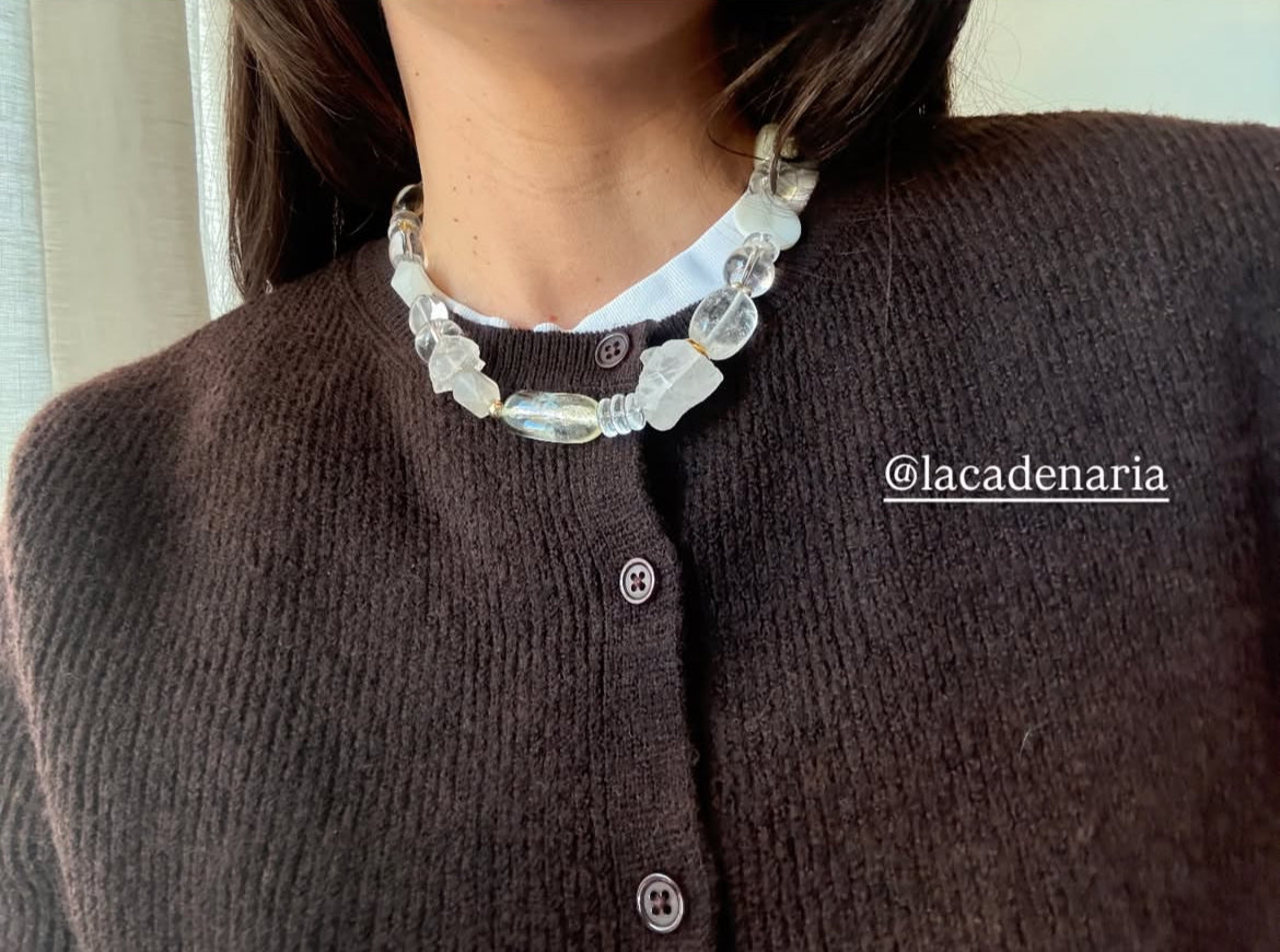 Esta pieza combina piedras de distintos tamaños, texturas y formas, trabajadas en un solo tono: blancos, transparentes y destellos sutiles que evocan la delicadeza del cuarzo.