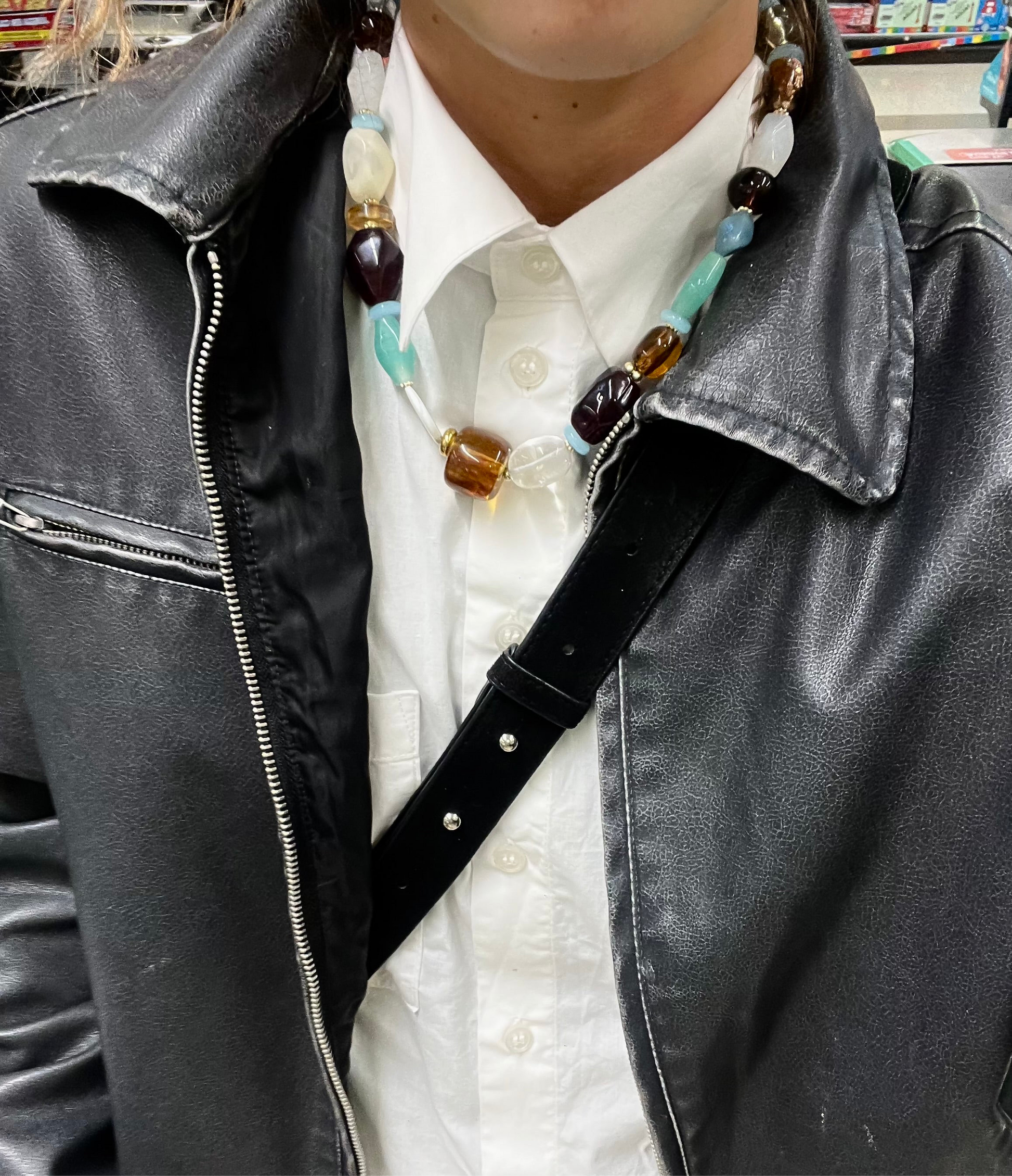 Materiales: piedras naturales, cuentas de vidrio y resina.