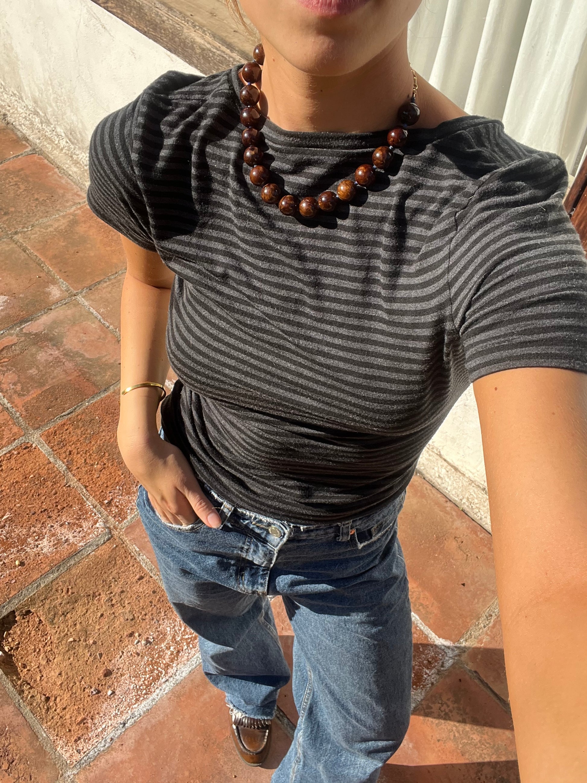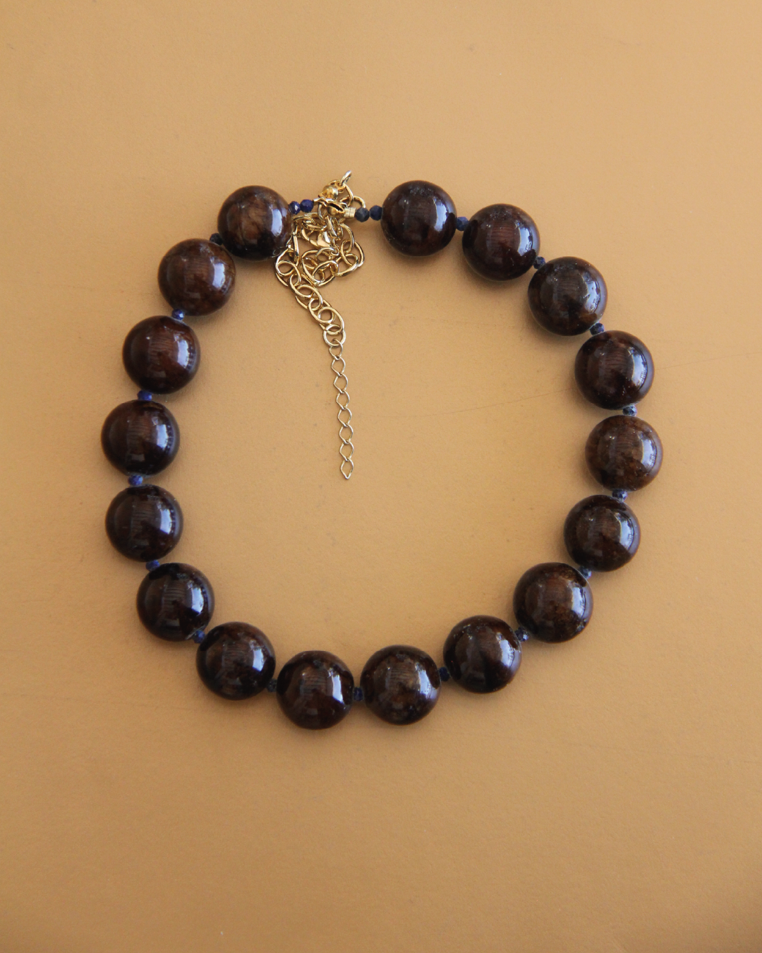 Este collar presenta piedras redondas de ónix esmaltado en color café, intercaladas con delicadas mostacillas de lápiz lázuli facetado que aportan un toque de luz y dinamismo.